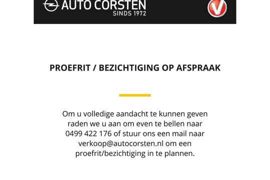 Kijk voor meer informatie, foto's, en onze actuele voorraad op onze site: www.autocorsten.nl of neem telefonisch contact met ons op; 0499-422176. Alle moeite is genomen om de informatie op deze internetsite zo accuraat en actueel mogelijk weer te geven, fouten zijn echter nooit uit te sluiten. Vertrouw daarom niet alleen op deze informatie, maar controleer bij aankoop de zaken die Uw beslissing zouden kunnen beïnvloeden. Auto Corsten sluit iedere aansprakelijkheid voor de in deze advertentie verstrekte informatie uitdrukkelijk uit. Auto Corsten is Opel Specialist , Vakgarage en Bovag erkend bedrijf sinds 1972.