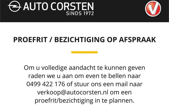 Kijk voor meer informatie, foto's, en onze actuele voorraad op onze site: www.autocorsten.nl of neem telefonisch contact met ons op; 0499-422176. Alle moeite is genomen om de informatie op deze internetsite zo accuraat en actueel mogelijk weer te geven, fouten zijn echter nooit uit te sluiten. Vertrouw daarom niet alleen op deze informatie, maar controleer bij aankoop de zaken die Uw beslissing zouden kunnen beïnvloeden. Auto Corsten sluit iedere aansprakelijkheid voor de in deze advertentie verstrekte informatie uitdrukkelijk uit. Auto Corsten is Opel Specialist , Vakgarage en Bovag erkend bedrijf sinds 1972.