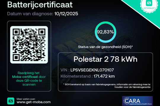 De acceleratie van de elektrische Polestar 2 is indrukwekkend. Dit exemplaar heeft 171474 kilometer gelopen, het bouwjaar is 2022. De actieradius van deze auto is met 515 kilometer ruim voldoende voor de meeste dagelijkse ritten. De accu is binnen 7 uur opgeladen. Een krachtige motor geeft deze auto zijn sportieve prestaties. Het met leer beklede interieur is comfortabel en stijlvol. Zit u goed? De stoelen zijn eenvoudig instelbaar dankzij de elektrische bediening met geheugen. Alles aan deze auto is ontworpen voor comfort, tot aan de stoelverwarming, verwarmbare achterbank, en verwarmbaar stuur. De elektrisch bedienbare achterklep opent met een druk op de knop. Door het glazen panoramadak heeft u een weidse zichthoek en geniet u van licht en een gevoel van ruimte. In deze Polestar profiteert u onder andere ook van: 19 inch lichtmetalen velgen, LED koplampen, zwarte hemelbekleding, getint glas, in delen neerklapbare achterbank en LED-achterlichten.