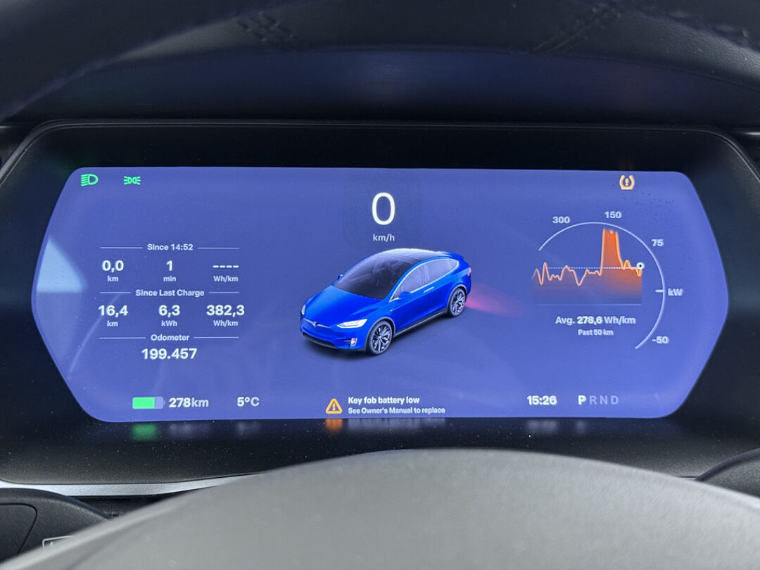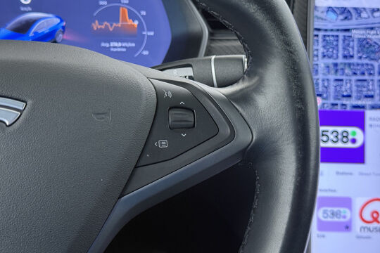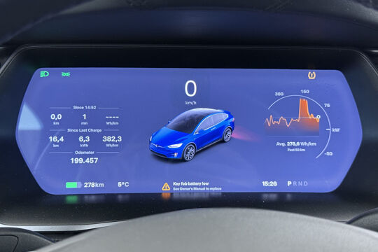 Zoals u mag verwachten van deze Tesla Model X is hij uitgerust met een reeks aan actieve veiligheidssystemen. De actuele snelheidslimiet, een inhaalverbod en andere verkeersborden; de verkeersborddetectie ondersteunt u tijdens elke rit. Het Lane-keeping systeem let constant op en waarschuwt of corrigeert als u onoplettend over de lijnen van de rijstrook gaat. In deze Tesla vinden we verder een dodehoekdetectie, hill hold functie, autonoom remsysteem en bandenspanningcontrolesysteem.
